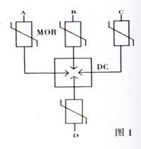 ZDB過(guò)壓保護(hù)器原理圖見(jiàn)圖1,圖中MOR為氧化鋅閥片,DC為單間隙體。由于本產(chǎn)品采用硅橡膠復(fù)合外套整體模壓一次成形,引出線采用硅橡膠高壓電纜,故安裝時(shí),無(wú)需考慮相間距離和對(duì)地距離,只需將標(biāo)有單元的電纜接地外,其余三個(gè)分別任意接A,B,C三相即可。
